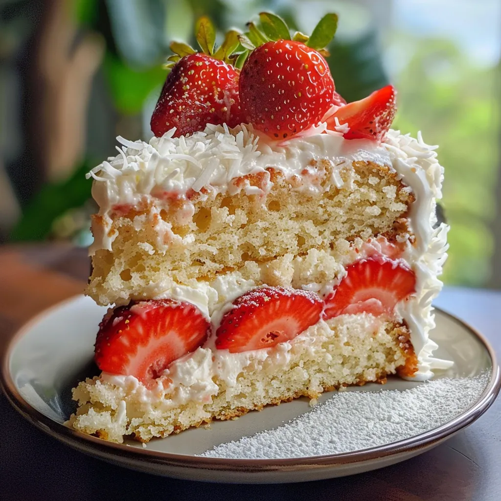 - Preheat oven to 350°F (175°C). Sift flour, sugar, baking powder, baking soda, and salt; mix well. Combine butter, almond milk, and vanilla; mix until smooth. Add egg, Greek yogurt, and coconut flakes; blend thoroughly. Pour batter into greased 8-inch or 9-inch pan and bake for 25-30 minutes. Cool completely, then top with sliced strawberries and whipped cream.